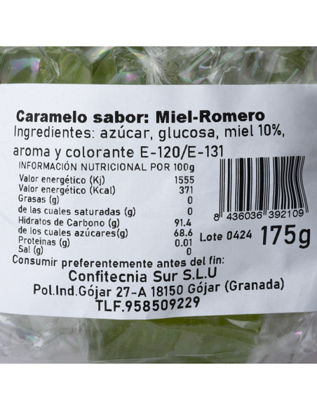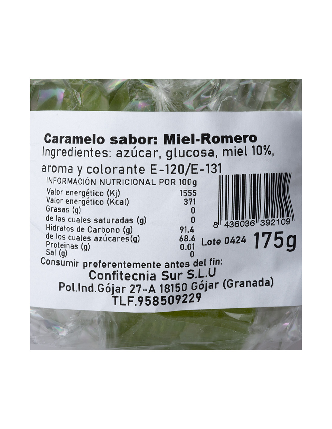Ingredientes: azúcar, glucosa, miel (10%), aroma y colorante: E-120/E-131
