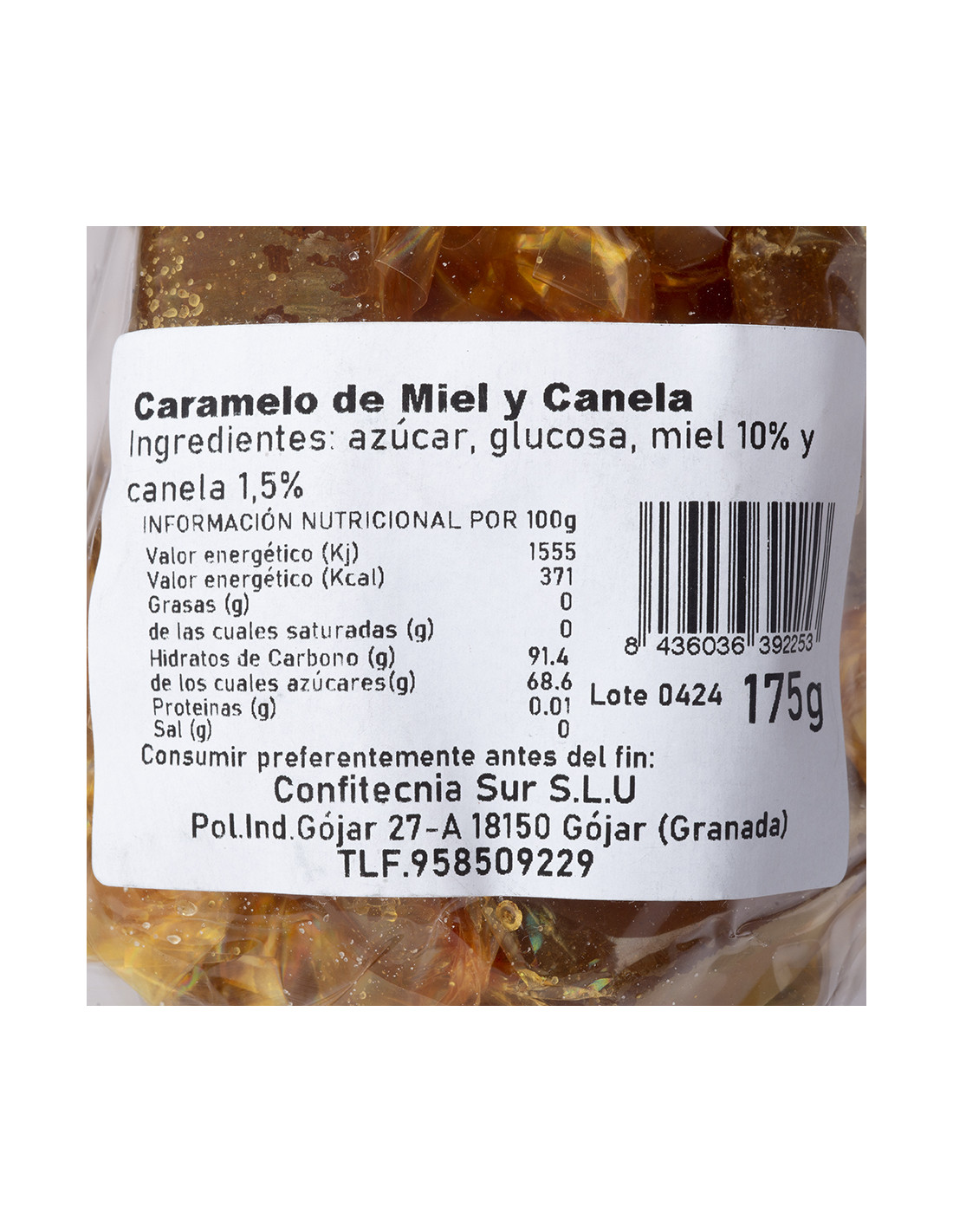 Ingredientes: azúcar, glucosa, miel (10%) y canela.