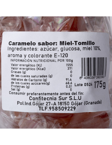 Ingredientes: azúcar, glucosa, miel (10%), aroma y colorante: E-120