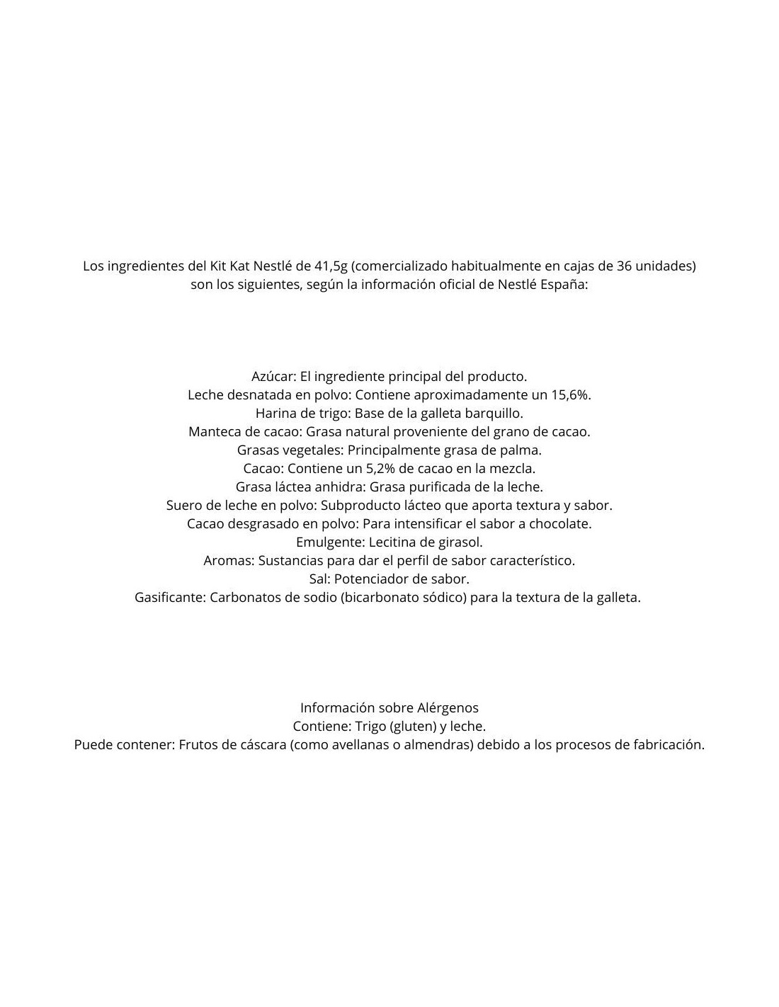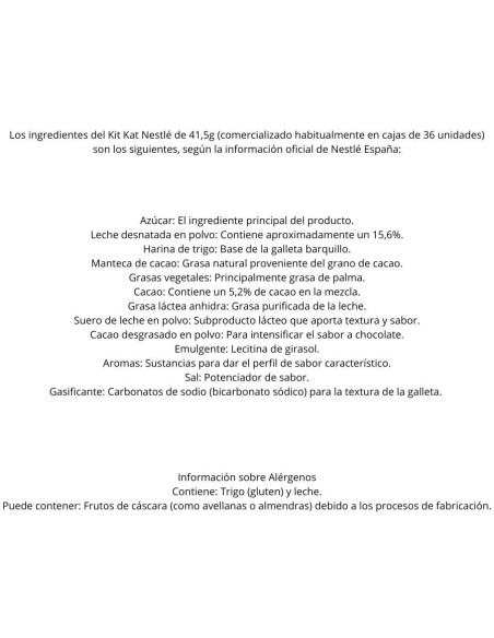 Galleta Crujiente(34%)harina de trigo,azucar,grasas vegetales,pasta de cacao,manteca de cacao,leche desnatada en polvo,suero de leche en polvo,cacao desgrasado en polvo,gasificante(carbonato de sodio,sal,emulgente(lecitina de girasol.
