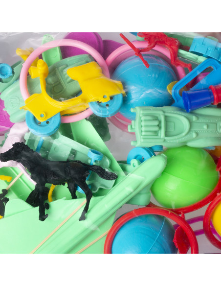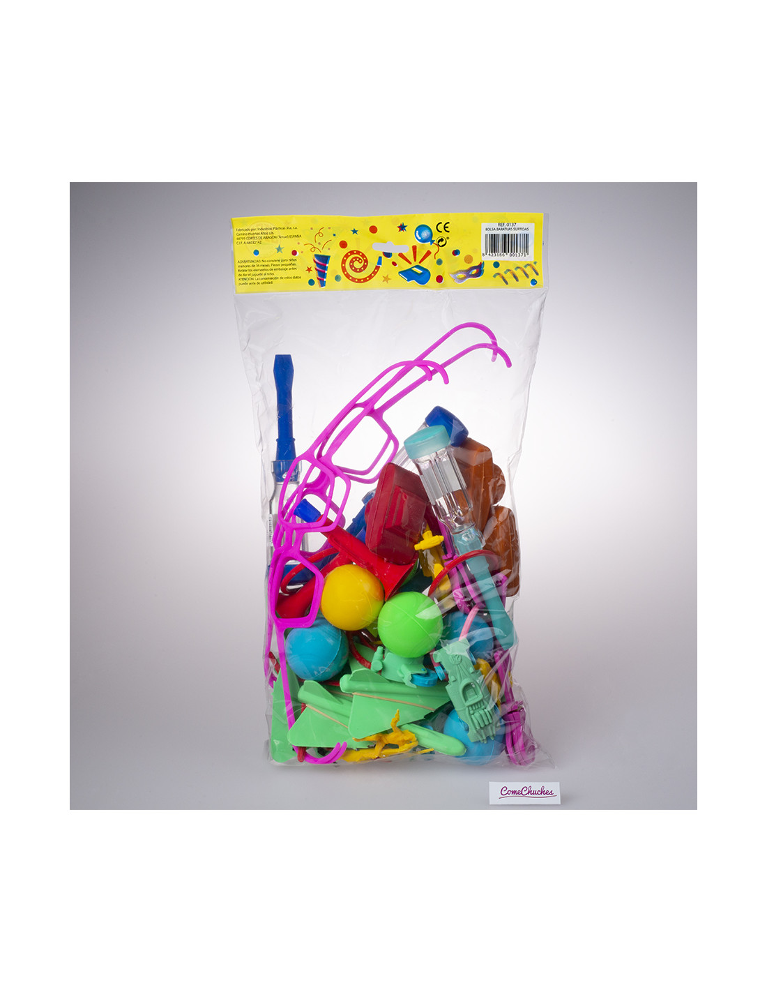 Dentro de la bolsa lleva: caballito,gafas,trompeta,aviones,pelotas,pulseras,motos,muñecos...