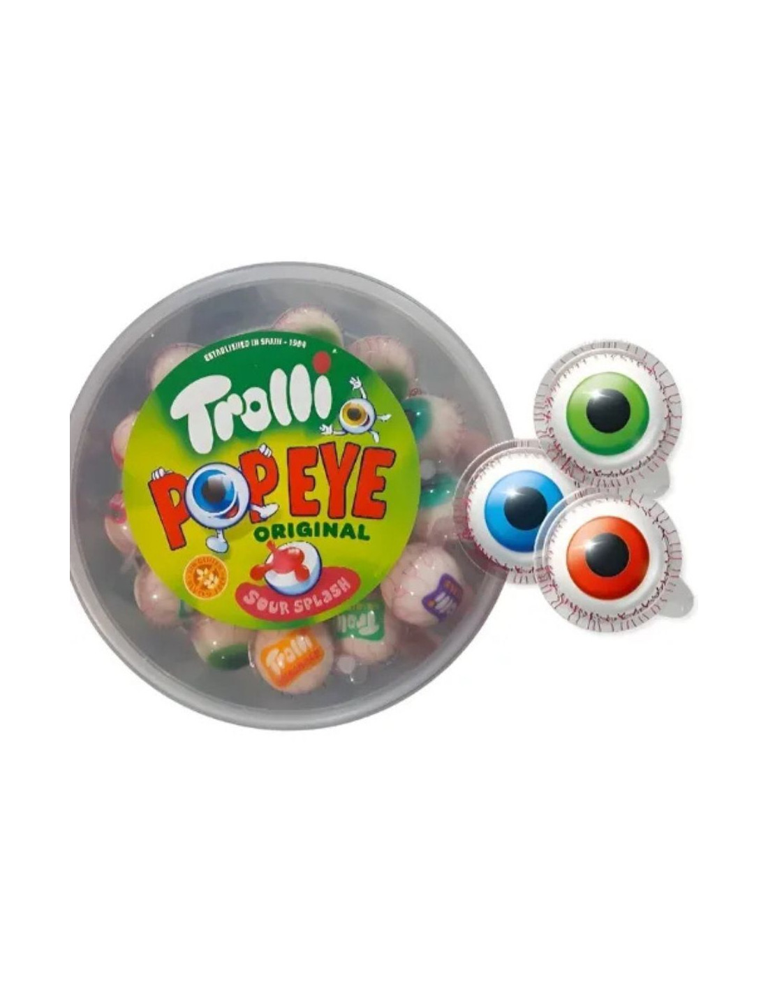 Es una gominola tridimensional con forma de ojo,reconocida por su textura suave y su relleno liquido acido sour splash.Se presenta generalmente en una caja o tarro que contiene piezas envueltas individualmente,ideal para eventos tematicos como Halloween.